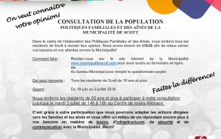 POLITIQUES FAMILIALE ET DES AÎNÉS Consultation publique Dans le cadre de l’élaboration de la Politique Familiale et des aînés, nous invitons tous les résidents [...]