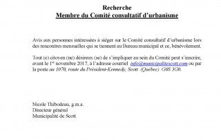 Membre du Comité d'urbanisme recherché Avis aux personnes intéressées à siéger sur le Comité consultatif d’urbanisme lors des rencontres mensuelles qui se tiennent au Bureau [...]
